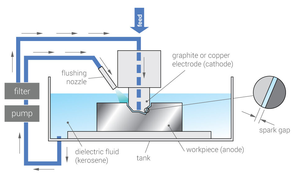 عملیات اسپارک باعث جداسازی ذرات از قطعه کار یا همان قالب (انواع قالب های پلاستیک و قالب های دایکاست)می شود. البته در همین زمان خوردگی روی الکترود یا همان قطعه مس نیز با نرخ کمتری به وجود می آید.